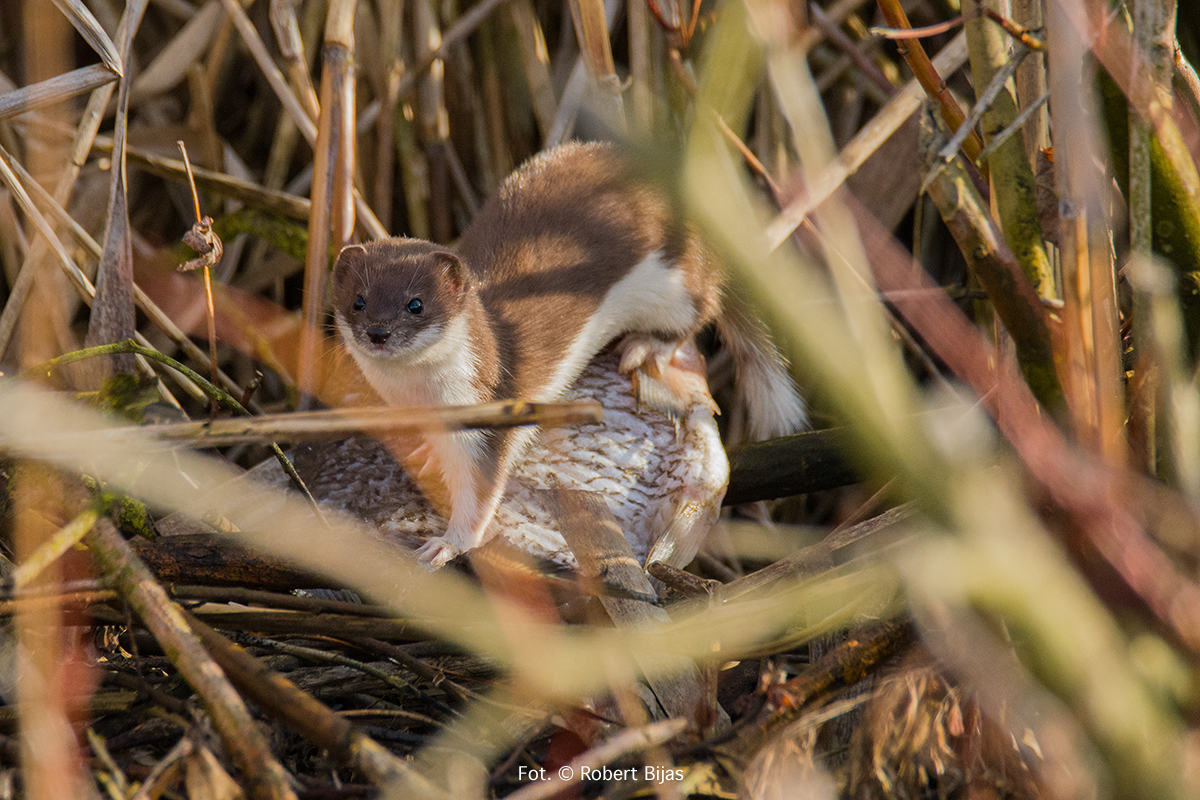 Od znajomej dostałem informację i bardzo zachęcające fotografie. Tak, fotografie łasicy. Pojechałem na obserwację na zbiornik niezbyt odległy. Osiedziałem się co nie miara, i rozmawiając z fotografami. Zrobiliśmy mnóstwo zdjęć mniej lub bardziej udanych. Były to tylko fotografie ptaków, a w głowie miałem tylko ją. Małą zwinną zwierzynę o fenomenalnych zdolnościach łowieckich. W końcu dałem sobie spokój w tym dniu. Na drugi dzień zaplanowałem zasiadkę już dużo wcześniej i bardziej uważną. Gdy nadzieja po 3 godzinach oczekiwania zaczęła ginąć, pojawiła się ona, a właściwie On łasic, samiec łasicy. Moje wyobrażenie boleśnie zdeżyło się z rzeczywistością. Jakież to szybkie cholerstwo. Pierwsze zdjęcie i dupa, dosłownie i w przenośni. Nim ustawiłem kadr już tylko ogon z przyległościami miałem na zdjęciu. Porażka. Czas leci, a ja bez foty sensownej. W końcu, udało mi sie ja złowić w kadrze, ale czy jestem zadowolony z efektów? Oczywiście nie. Myślę że poradzę sobie gdy znam "zasady walki."