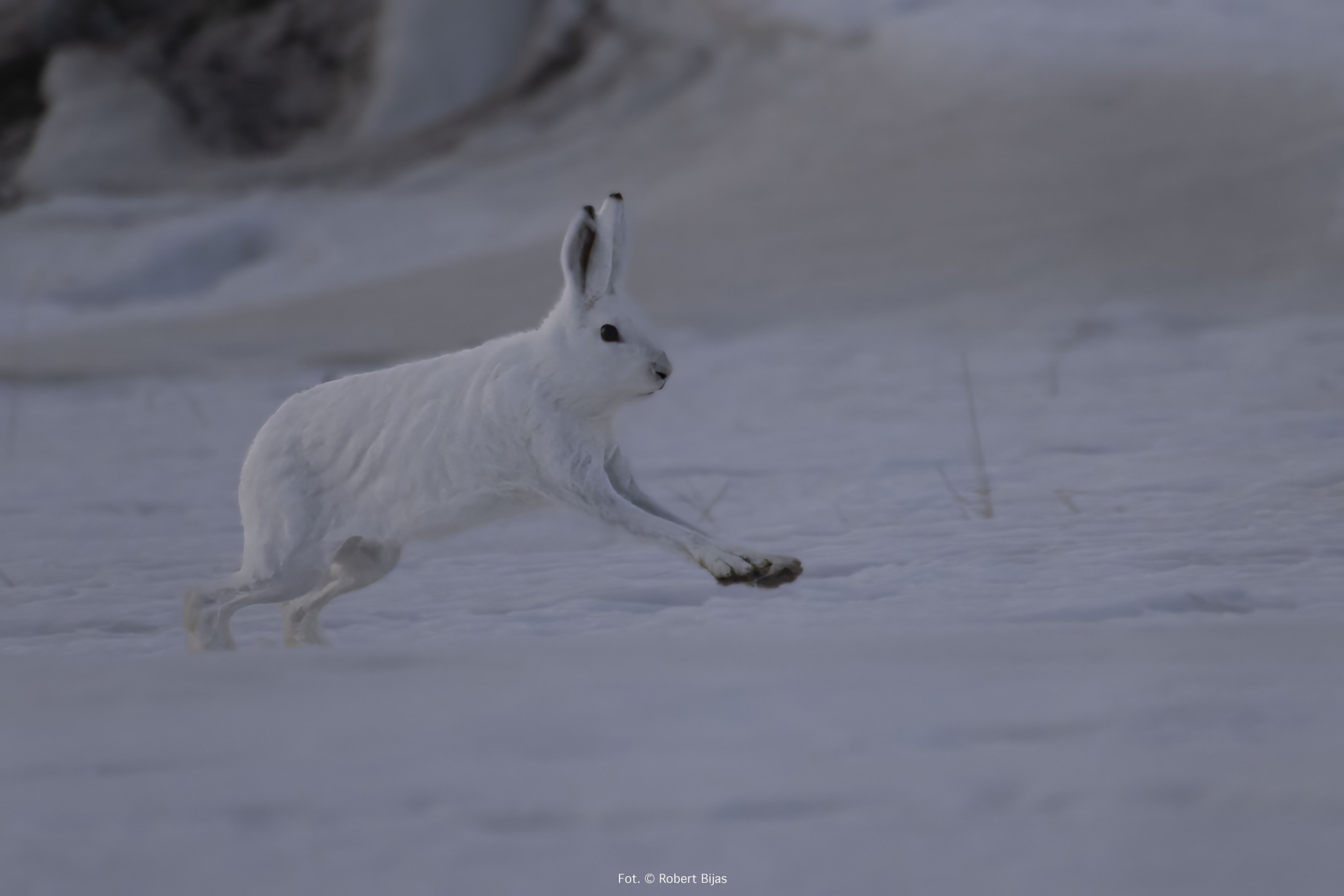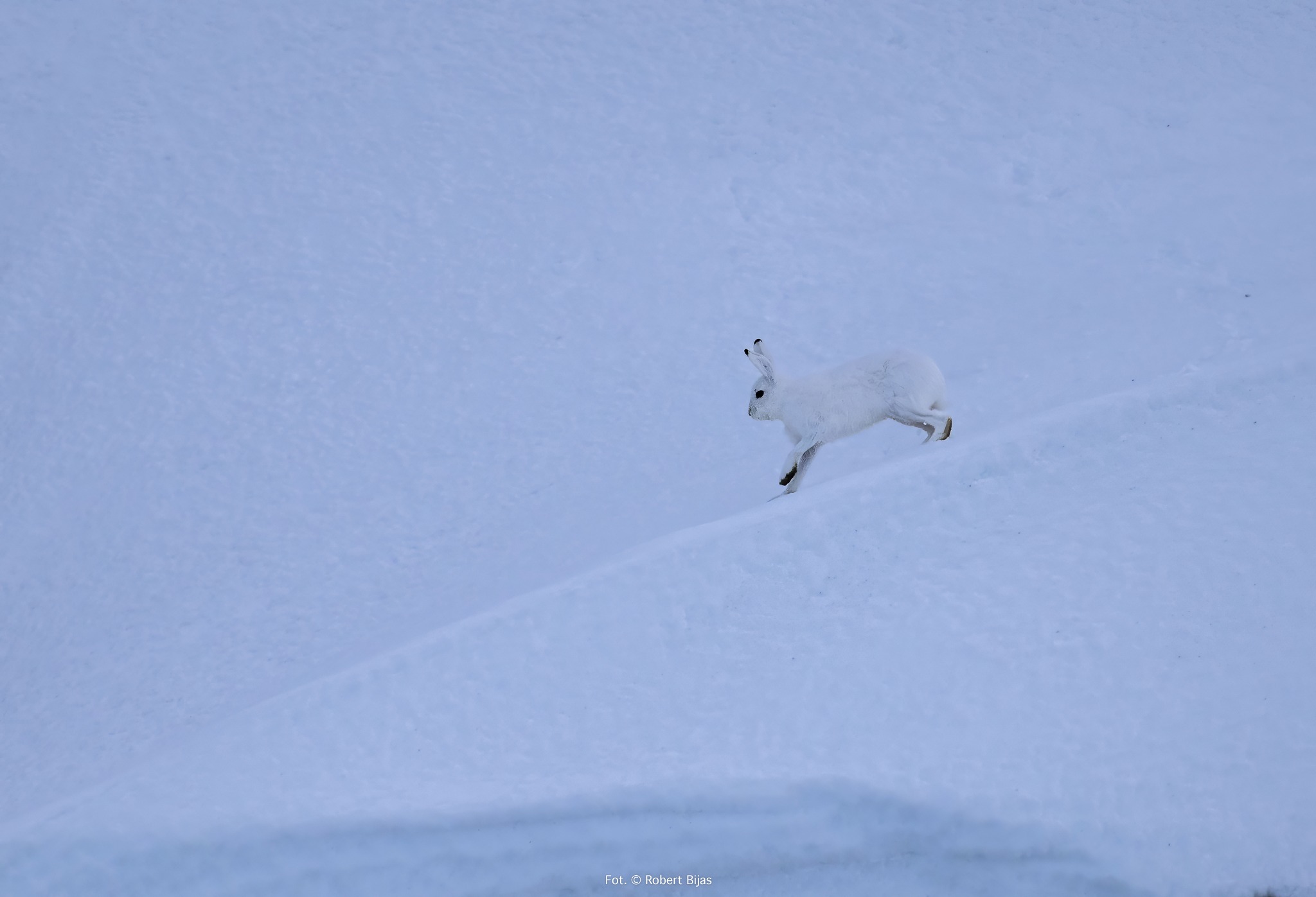 Podobno, dawno, dawno temu, gdzieś na północy Polski. A już na pewno na północy Europy żyje stwór który swoim ubarwieniem stara się wtopić w otoczenie. Tylko stwórca starając się być sprawiedliwym i dać szansę też wykarmienia młodych drapieżników „wsadził” czubki uszu zająca całkiem białego w sadzę, no a że zaciekło aż do wewnątrz? No cóż. Bywa i tak. Podeszwy jego wielkich stóp też są prawie czarne. Te jego łapy to naprawdę mistrzostwo świata. I tu jest przewaga tego stwora bo nie zapada się tak bardzo w śniegu jak jego naturalni prześladowcy.Pisałem już co to za zwierzak? Nie? No to już przedstawiam.