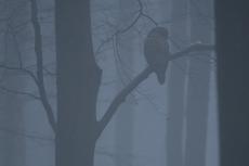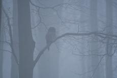Był styczeń, na przemian padał deszcz, wiało, padał śnieg. Potem było ciepło, następstwem tego ciepełka (względnego) była mgiełka. Taka piękna i fotogeniczna, zwiewna niczym panna młoda o świcie wiosennym. Gdy dzień miał się ku zachodowi mgła robiła się coraz bardziej gęsta i sina, oblepiała każdy element, buki smukłe i czarne od wilgoci po puszczyka uralskiego. Nadszedł długo oczekiwany dzień, jest śnieg, jest mróz, jest szansa na Puchu i to nie nie jednego. No i nadzieja na klimaty. Ubrany solidnie opuszczam moją strefę komfortu, zjazd windą tylko jedno piętro a już czuć chłód. Witam się z Magdą i Markiem i ich Pufą. Pufa jest ich psią miłością bezwzględnie. Pokonujemy kilometry zaśnieżonej i oblodzonej drogi. Im bliżej celu nasze głowy jak radary przeczesywały drzewa. Oczy nam wychodziły z orbit by przebić coraz gęstszą mgłę. Nagle Magda krzyknęła. Stój!!! Jest. Jest!!! No tam siedzi, widzicie! Nawet ja najgorzej widzący i najmniej spostrzegawczy dostrzegłem magię i Puchu. Zrobiło mi się cieplutko na sercu, wreszcie jest, jaki piękny. Starałem się uchwycić magię tego miejsca. Czy mi się udało sami oceńcie. A potem nastąpiła tragedia jakich wiele w ostatnim czasie. Już nie zobaczyliśmy więcej Puchu, za to Sthile grały swą smętną melodię. Żeby jakoś smutek ukoić jeździliśmy w różne miejsca gdzie występował Puchu zwyczajny. Było pięknie i śnieżnie, ale świadomość że nie prędko zobaczy się Urala, może to był ostatni raz? Tfu, tfu. Ech. Nadeszły duże opady śniegu i mogłem zrobić kilka fotografii które pozwolą kiedyś wspomnieć że i śnieg bywał u nas w zimie i woda była. Kilka drobnych ptasząt sfotografowałem przez okno w moim pokoju. Ale to nie Puchu.